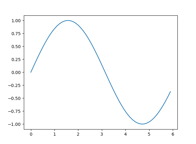 x = np.arange(0, 6, 0.1) # 0부터 6까지 0.1 간격으로 생성 ex) 0, 0.1, 0.2, 0.3